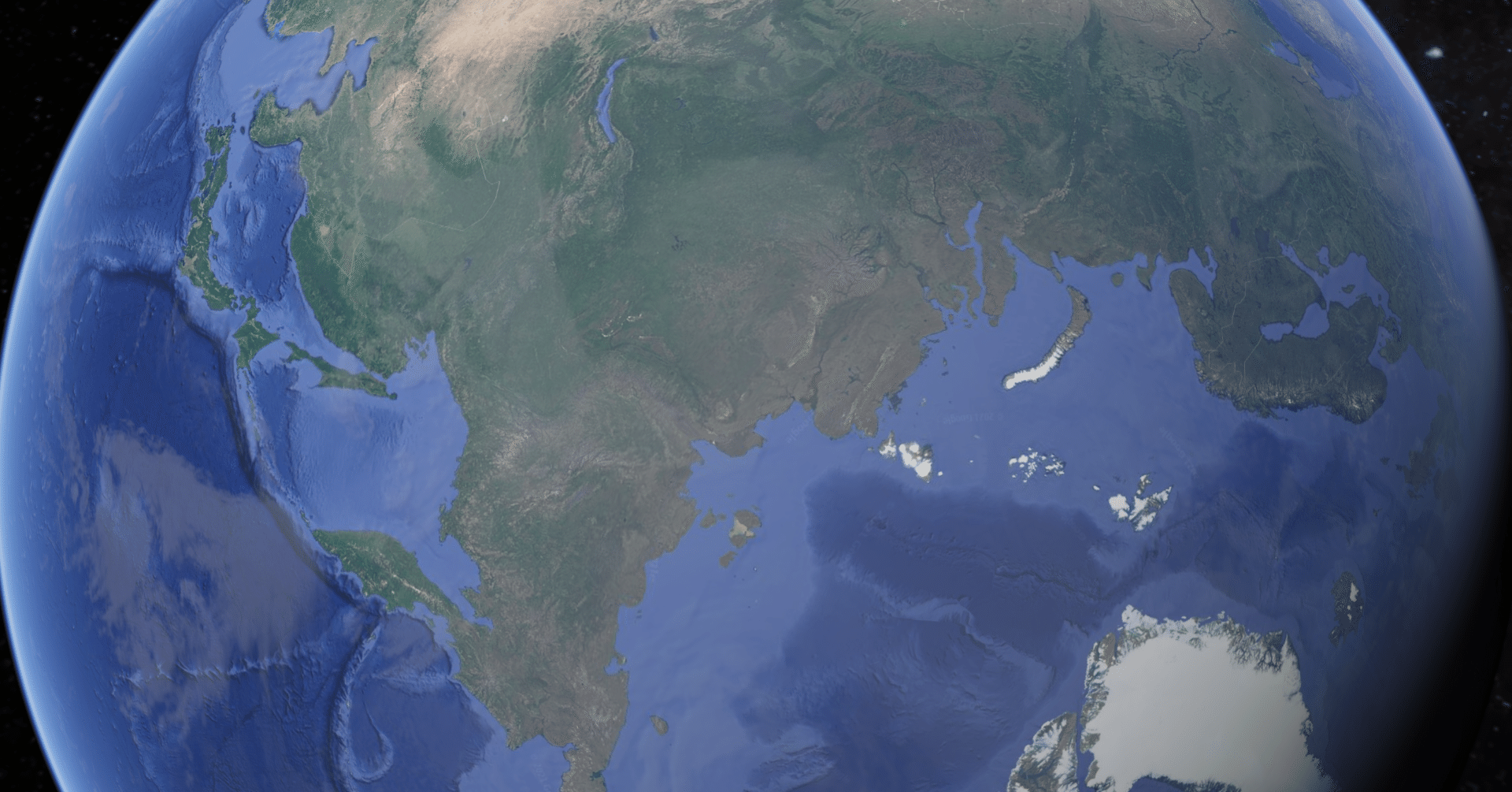 とは言っても、日本にとって環太平洋地域はもちろん重要です。こちらもGoogleEarthで見てみると、アメリカのアラスカ半島から延びるアリューシャン列島・カムチャッカ半島・クリル諸島・千島列島を経由して日本列島まで島々が点々と連続しています。